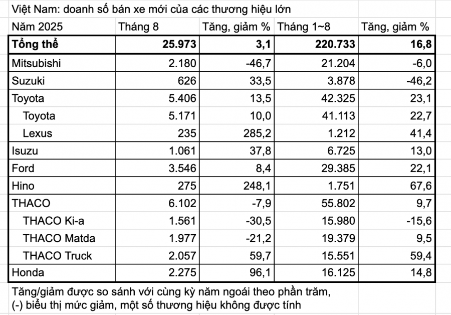 Trong khi đó, tính lũy kế 8 tháng đầu năm 2025, doanh số đạt 220.733 xe, tăng 16,8 % so với cùng kỳ năm 2024.